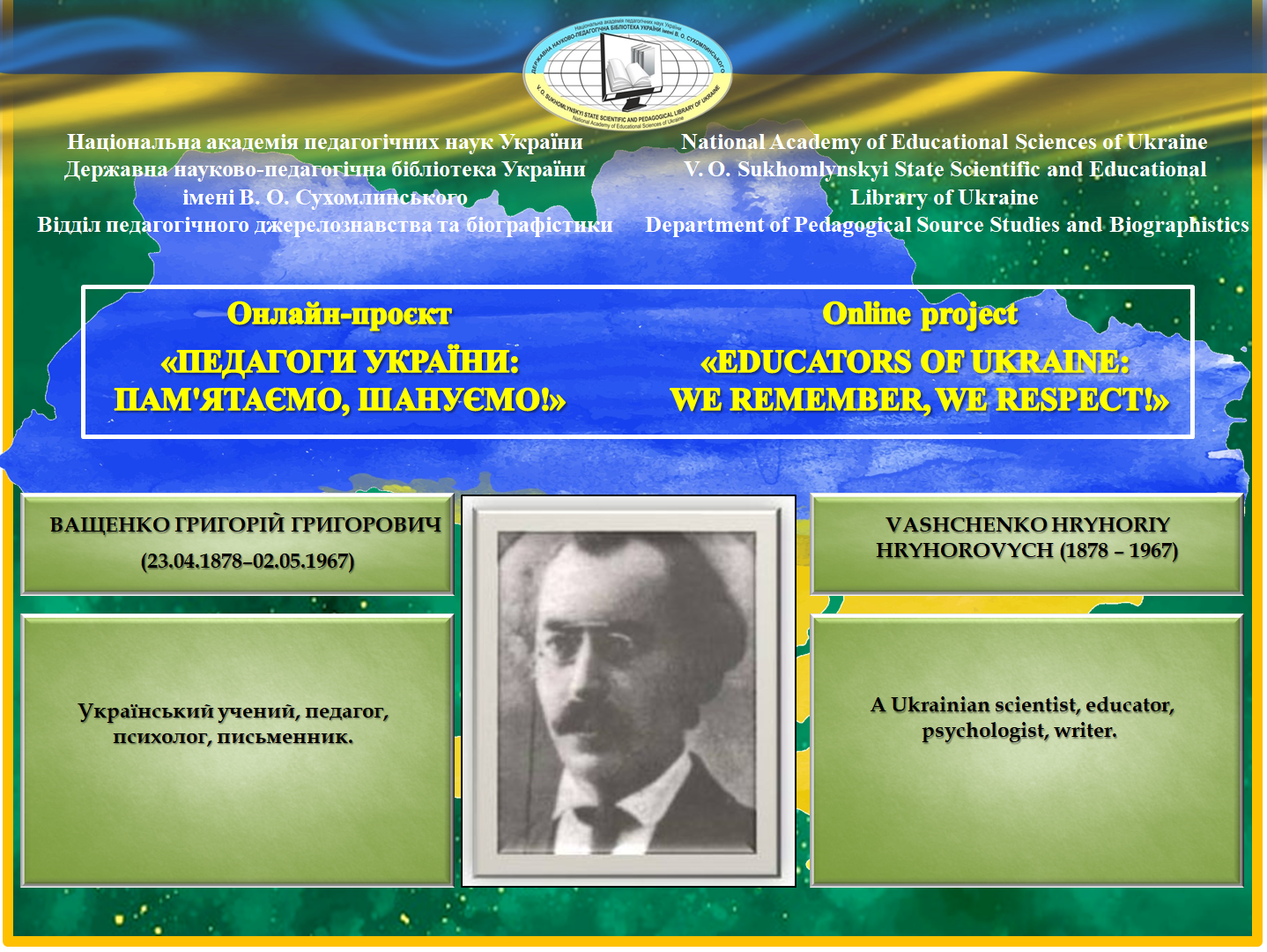 The information about H.H. Vashchenko’s life and activities is presented on the page «Vashchenko Hryhoriy Hryhorovych» of the electronic information and bibliographic resource of the SSEL «Educators of Ukraine and the World», in the reference publication «Pedagogues of Ukraine (Second Half of the 19th – Early 21st Centuries): Encyclopaedic Biographical Dictionary» (scientific editor L.