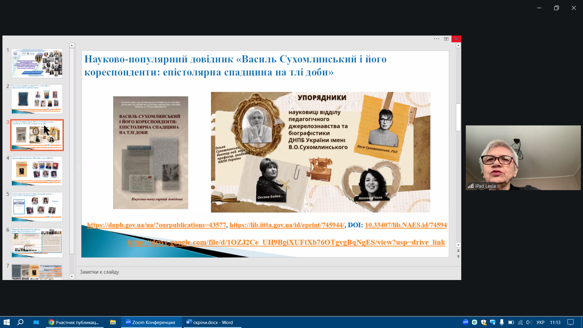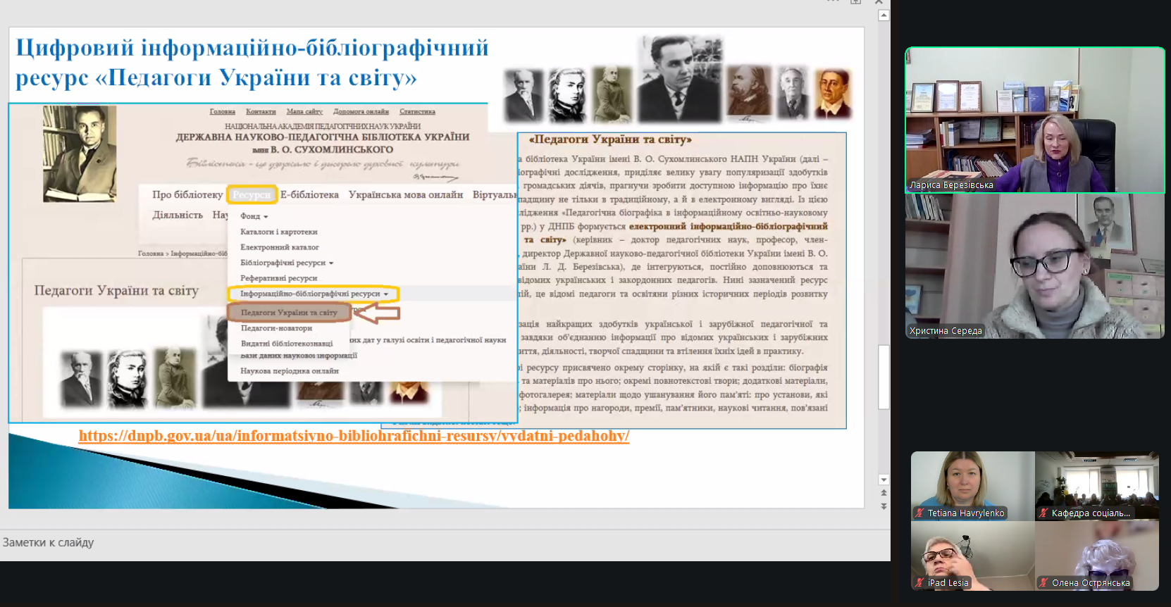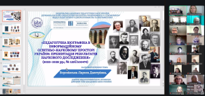 Модератор заходу Лариса Березівська подякувала Збройним силам України за можливість жити та працювати, привітала спільноту учасників і гостей, коротко схарактеризувала результати актуального дослідження, присвяченого педагогічній біографіці як багатовимірному феномену освіти та науки, компоненту інформаційного ресурсу суспільства, міждисциплінарній галузі науки, тісно пов’язаної з педагогікою, історією, бібліографією. Презентація