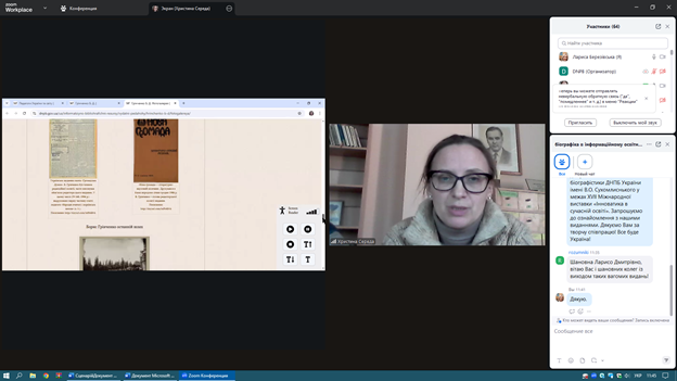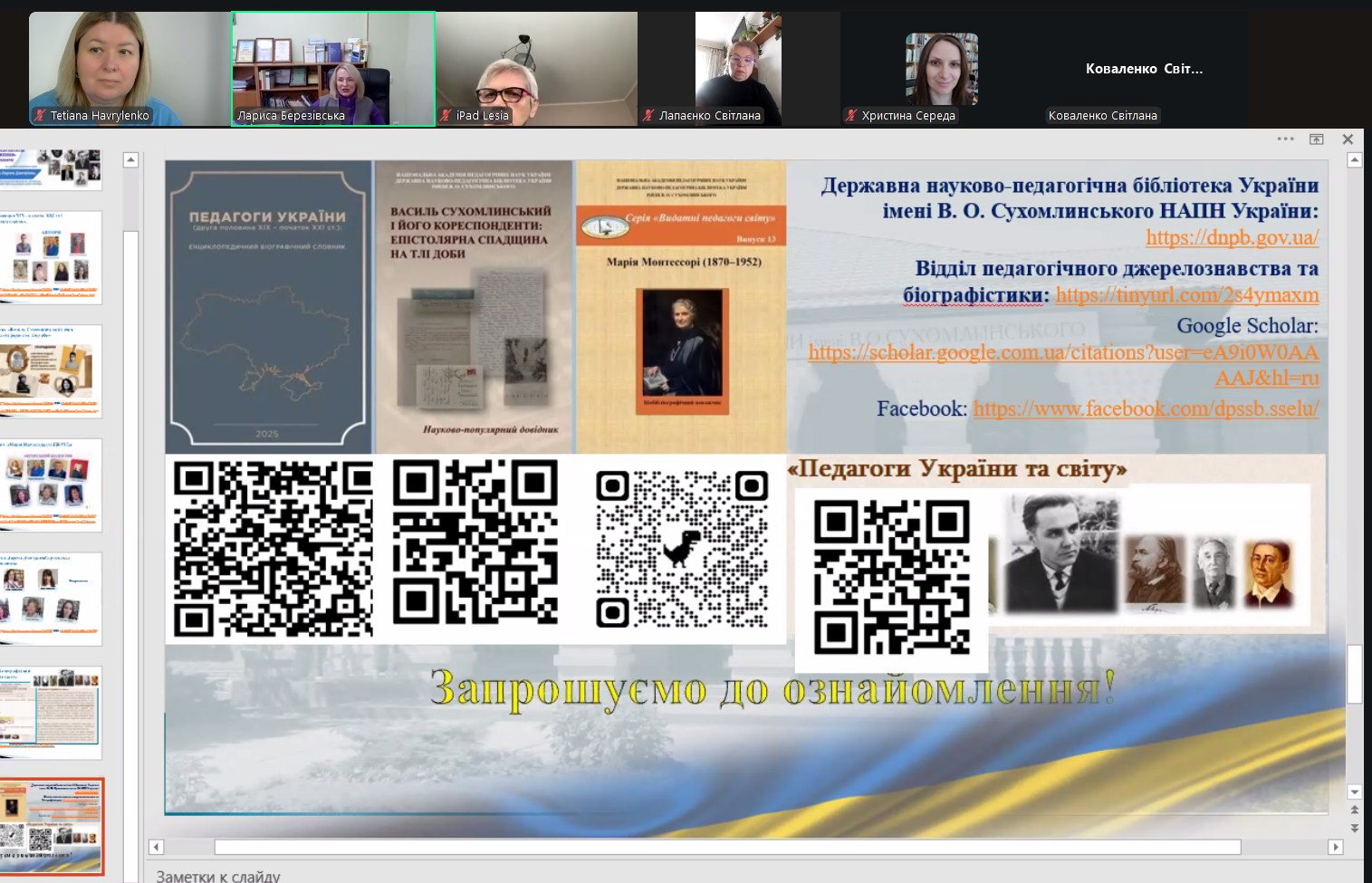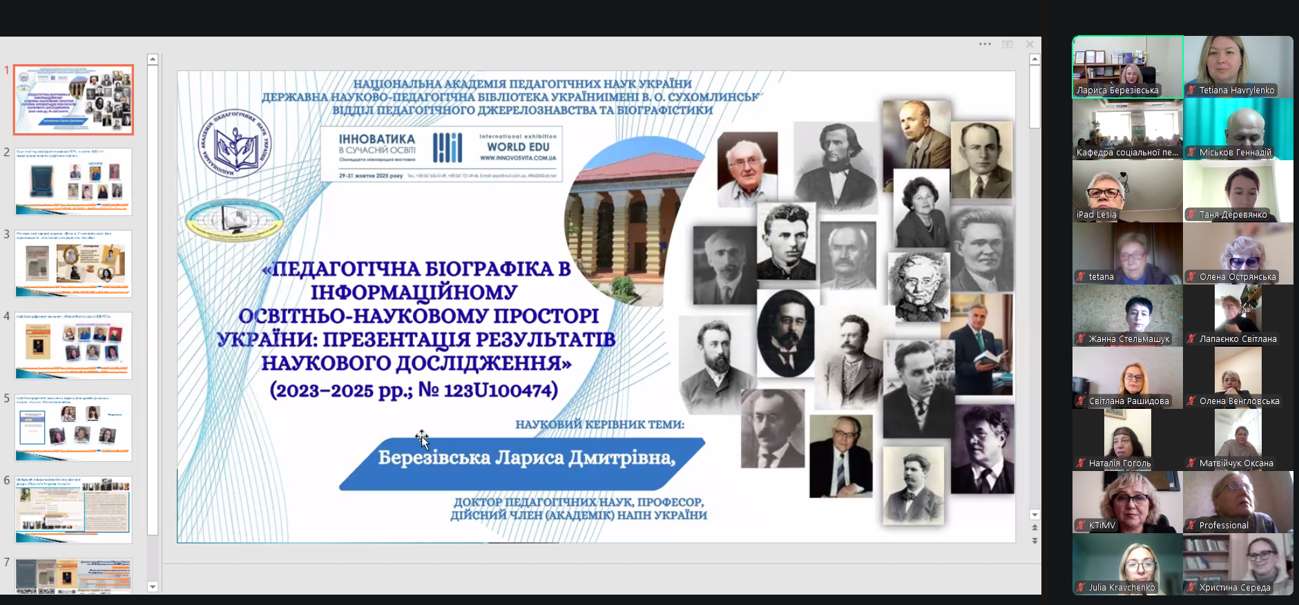 30 жовтня 2025 р. в межах ХVІІ Міжнародної виставки «Інноватика в сучасній освіті» (в онлайн-форматі) відбувся захід «Педагогічна біографіка в інформаційному освітньо-науковому просторі України: презентація результатів наукового дослідження», який організував відділ педагогічного джерелознавства та біографістики Державної науково-педагогічної бібліотеки України імені В. О. Сухомлинського НАПН України (далі – ДНПБ).