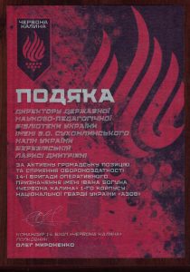 Директор ДНПБ України ім. В. О. Сухомлинського, доктор педагогічних наук, професор, дійсний член (академік) НАПН України Лариса Дмитрівна Березівська висловлює щиру вдячність командуванню 14-ї бригади оперативного призначення «Червона калина» за мужність у захисті нашої Держави та особисто полковнику Сергію Савичеву за ініціативу в налагодженні співпраці.
