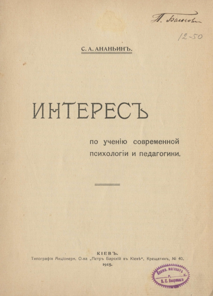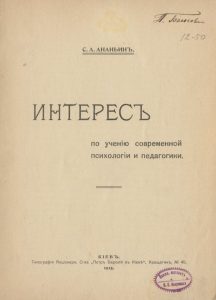 Праця С. А. Ананьїна «Інтерес. За вченням сучасної психології та педагогіки» (Київ, 1915) у виставковому проєкті Педагогічного музею України «100-річні книжкові і100рії»