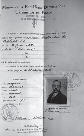 ![]() Сторінка паспорта В. Прокоповича, виданого Місією УНР у Франції 28 жовтня 1930 р. |