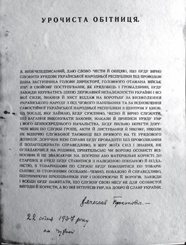 ![]() Урочиста обітниця В. Прокоповича на вірність Уряду Української Народної Республіки. 22 січня 1937 р., на чужині. |