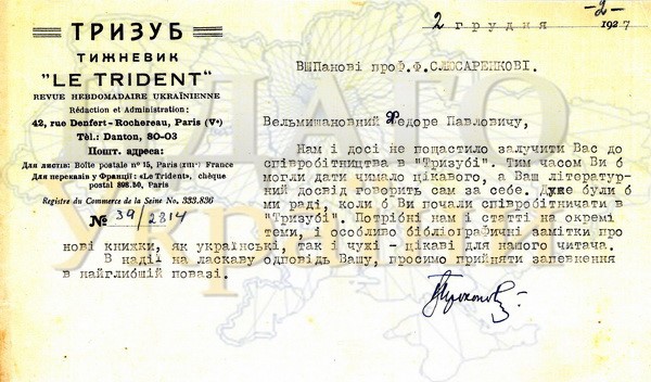 ![]() 1922 р., вересня 3. – Лист керівництва Архіву-музею визволення України (м. Відень), до складу якого входив директор Архіву-музею В. К. Прокопович, до П. П. Скоропадського з проханням передавати до Архіву-музею матеріали, що стосуються відродження і визволення України, та долучитися до збору пожертв на утримання Архіву-музею. |